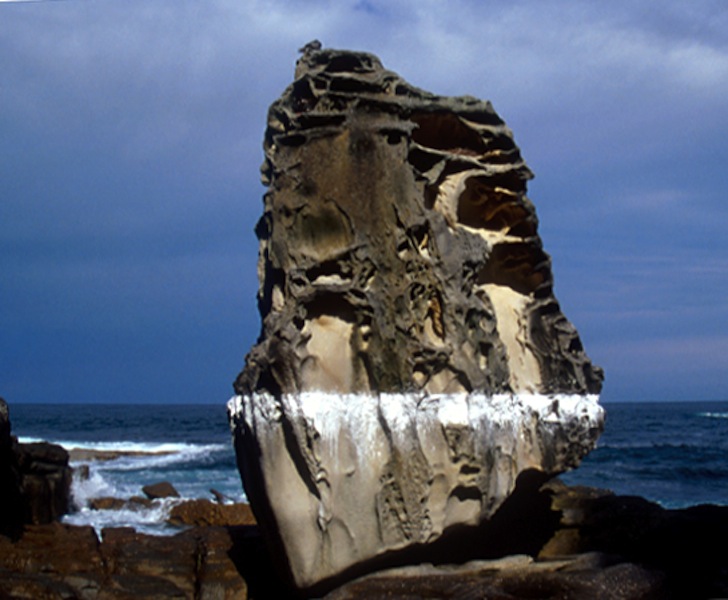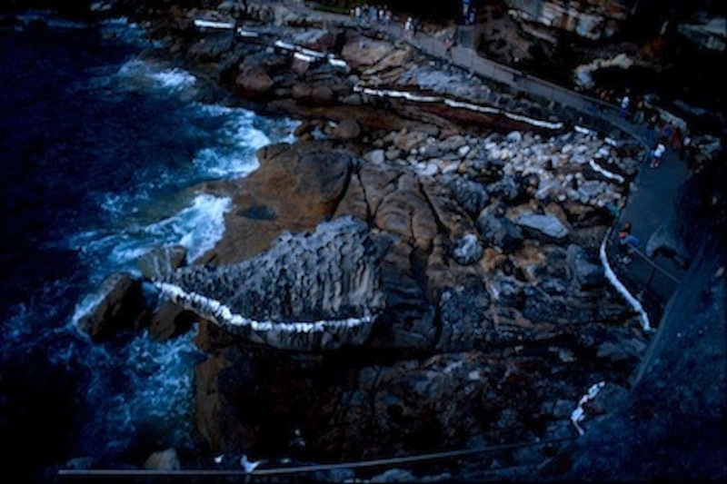 I spent the duration of the exhibition creating this salt line along the Bondi to Bronte cliffs above the rock platform, beginning at the Bondi end. After 8 days it rained and most of the line washed away, but I was so skilled by then that it was up again in no time and I managed to extend it right around the cove and out towards the headland. Another artist’s work initially occupied the huge freestanding rock in the middle of the cove, but it blew off early on and a few days later I was given permission to include the rock.