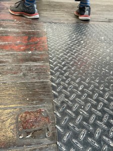 Walk from the top of the stairs to face Terrence Plaejnvaig’s pink and yellow A Virtual Painting (get close enough to write in the book), turn 90° to your right so you face roughly south, take one step and look down to spot two beautiful painted metal patches nailed into the wooden floor 32 cm apart, the longer and closer one is parallel to the floorboards, the other smaller one is at a bit of an angle.”